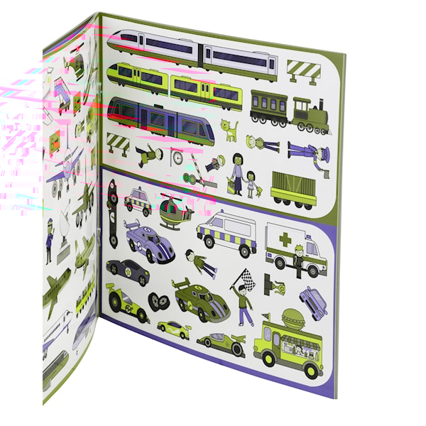 Utforsk en verden full av kjøretøy med Gjenbrukbar Klistremerkebok – Kjøretøy! Denne klistremerkeboken inneholder mange gjenbrukbare klistremerker av ulike kjøretøy som barna kan plassere på de medfølgende bakgrunnene igjen og igjen. Perfekt for å skape egne scener og la fantasien blomstre – flytt, plasser og skap nye eventyr hver gang!