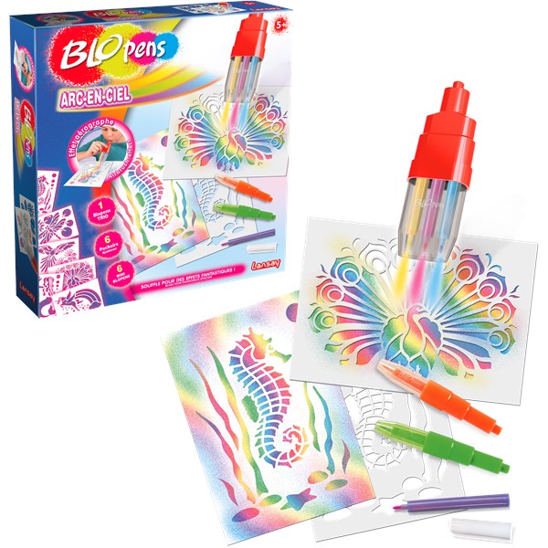 inneholder Blopens, stensiler og ark, slik at du kan begynne å male igjen. Med dette settet med regnbågstema få en Rainbow blopen, 6 mini-blopens, 6 sjablonger og papir.