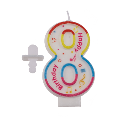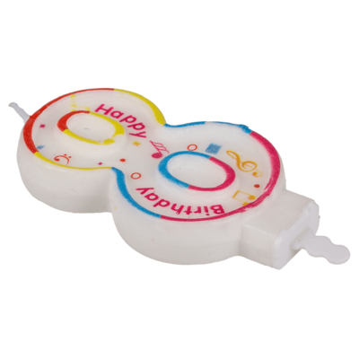 Bursdagen feires på beste måte med denne sifferlyset! Lyset har form som tallet åtte (8) og har en stilig design med mange hyggelige detaljer. Det har flere fine farger og symboler, samt innskriften "Happy Birthday". Perfekt for bursdagskaken!
