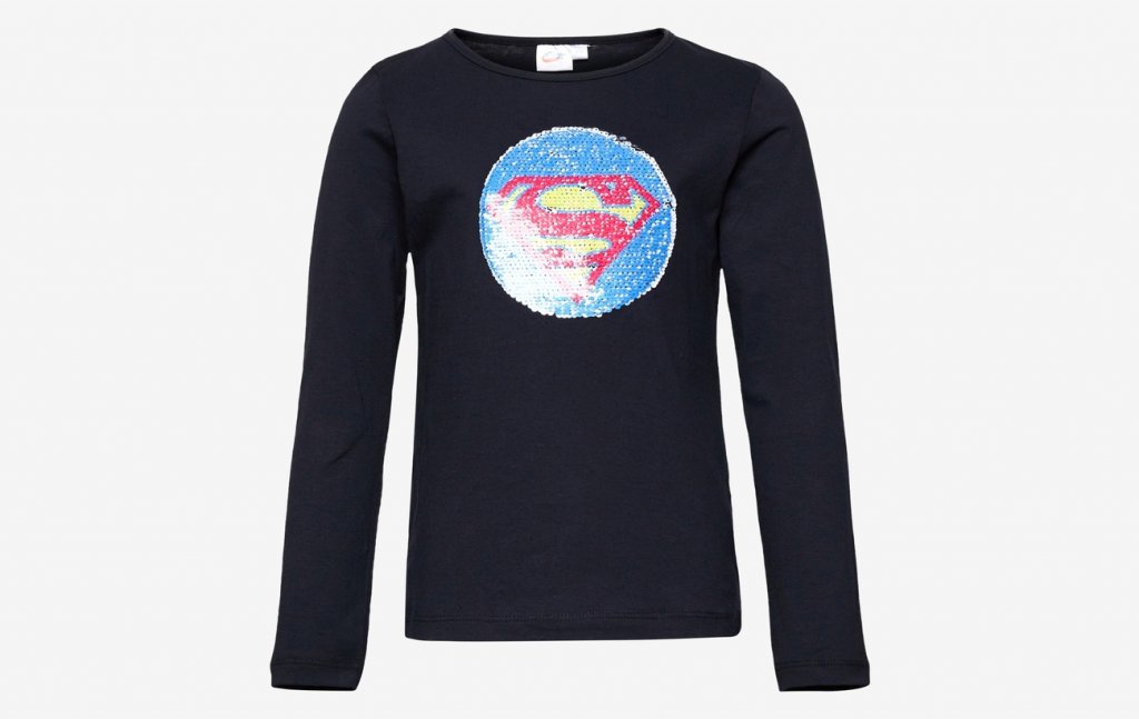 Nå er dette en langermet T-skjorte med motiver på Supergilrs merke og merket Wonder Woman som kan endres mellom dem ved å snu paljetterne opp eller ned som utgjør merkene.