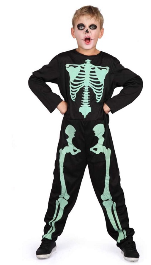 Barnet kan kle seg ut som et skjelett men ikke et hvilket som helst vanlig skjelett, et skjelett som lyser opp i mørket! Dette maskeradekostymet passer for fester med skumle temaer som Halloween. Med et skjelettkostyme kan barnet ditt late som om det er et skummelt skjelett som vil slå opp folk for å vise skjelettdansebevegelsene deres.
