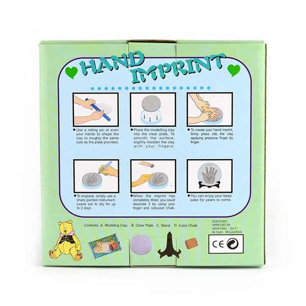 Med dette settet kan du enkelt lage barnehåndavtrykk og fotavtrykk i leire. smør modellen og legg den i den medfølgende skålen. Trykk babyens hender og føtter i gjørmen, vent en stund i ca 20-30 sek og la den tørke i ca 2 dager.