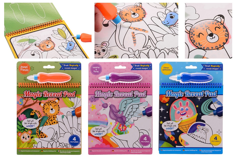 Denne spennende blokken inneholder fire gjenbrukbare bildesider. Bare fyll pennen med vann for å fargelegge hver side, og livlige farger vises med hvert penselstrøk.