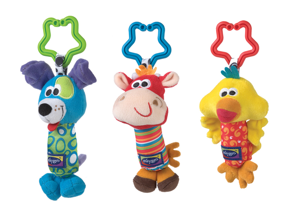 En herlig trio som gjør spaserturen mye morsommere! Dette settet gir deg hund, ku og fugl å henge i barnevognen. Hund har en rangle, kua har en bjelle, og fuglen piper. Spennende for en nysgjerrig baby! De små figurene hjelper også barnet med å utvikle finmotorikk, visuell persepsjon og andre viktige ferdigheter. - For oppheng i barnevogn - Hund, ku og fugl med forskjellige lyder