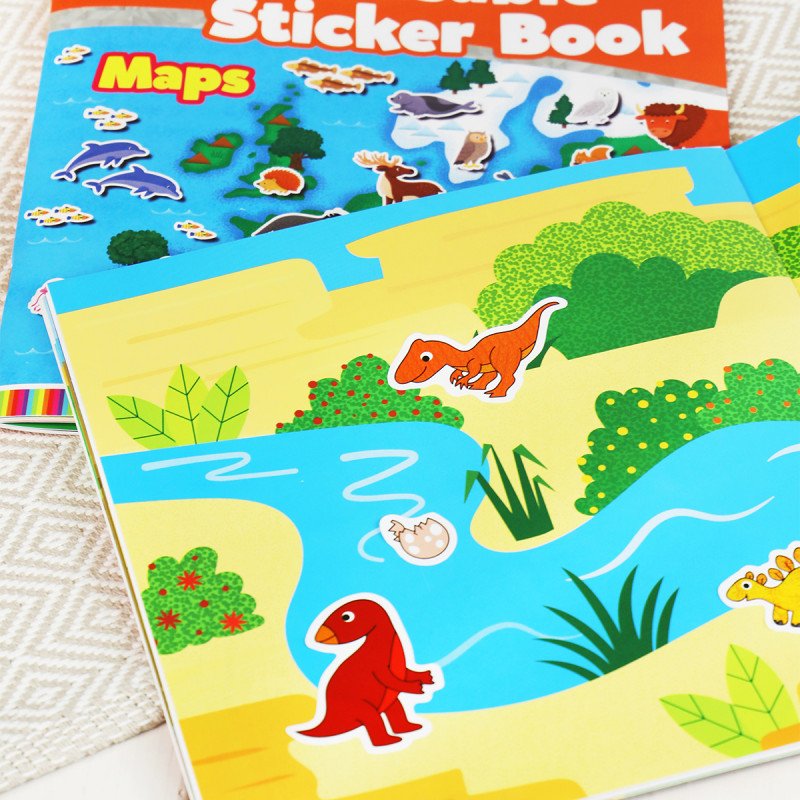 Å fortelle historier utvikler barns språkkunnskaper og å sette klistremerker i sin tur utvikler persepsjon og fingerferdighet. Med klistremerker kan barn fortelle historier som de har oppfunnet og lage og leke med det samtidig. Historien kan være basert på en av bakgrunnene i etikettboken, som historien kan bygges rundt. Klistremerker er gjenbrukbare, slik at du kan lage så mange forskjellige historier med bakgrunnsbilder og klistremerker som du noen gang kan finne på. Klistremerkeboken kan bæres enkelt og enkelt, selv for en tur, en hytte, en utflukt eller en bil. Boken har 8 forskjellige landskap og 150 dinosaur-klistremerker. En fantastisk gaveide!