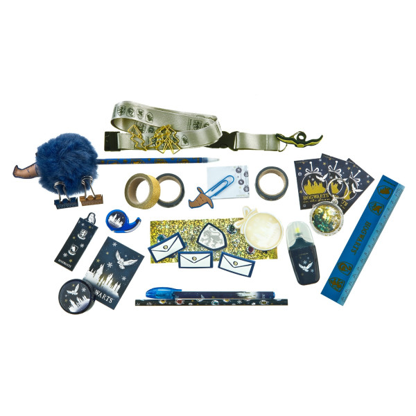 Formet viskelær, 3x washi-tape (papir, glitter og folie), 3 papirmerkelapper med foliedetaljer, folie-klistremerke, mini-tapedispenser, magnetisk bokmerke, formet binders, notatblokk, nøkkelbånd, penn med foliedekor, 2 binders, linjal med folie, markeringstusj, 3 Micky Mouse-formede binders, 3 formede tegnestifter, glitter-gelpenn, 2 notatblokker, viskelærtopp for penn, blyantspisser, akrylnøkkelring med glitter inni, og kulepenn med pompong og PU-topp.