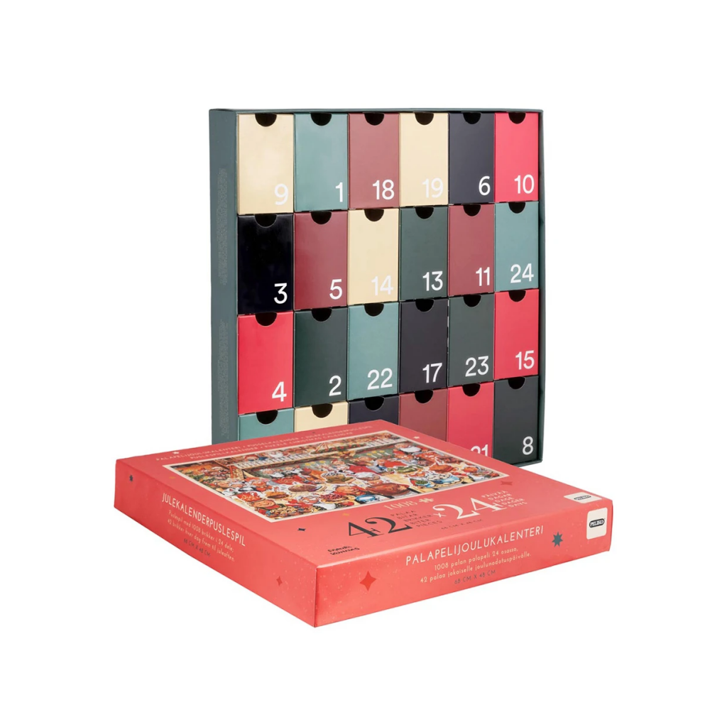 Bak hver luke skjuler det seg et nytt puslespill med 42 brikker – med motiver fra den kjente finske illustratøren Mauri Kunnas, kjent for sine varme og morsomme julefortellinger.