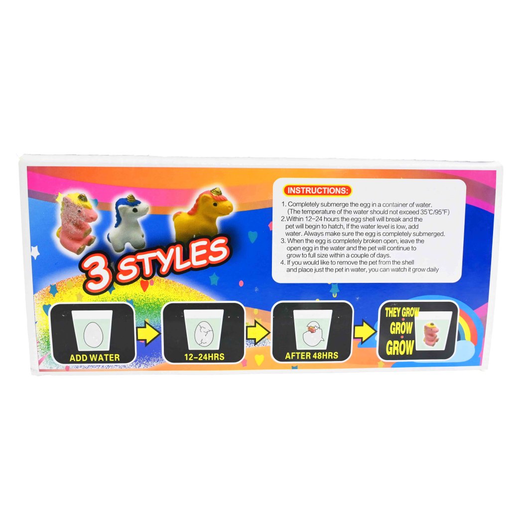 • Enkel i bruk – Legg egget i vann og vent på at enhjørningen kommer frem.