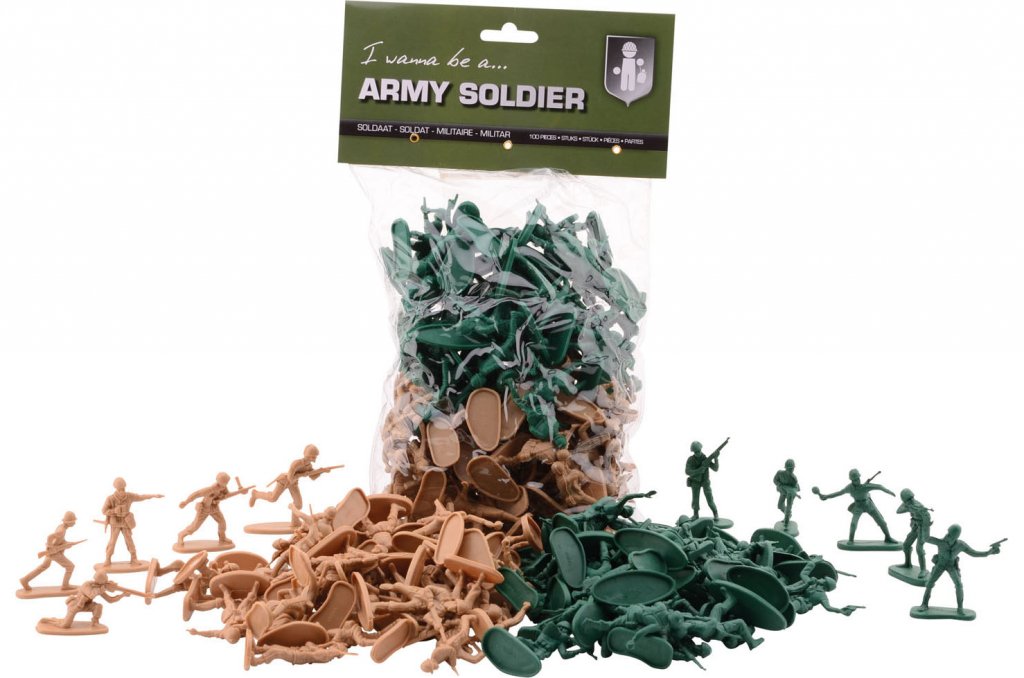 Leketøy soldater som selges i en pakke med 100 soldater i plast i beige og grønn farge! Soldatene er mellom omtrent 5 cm. De står på en liten tallerken og kommer i forskjellige posisjoner.