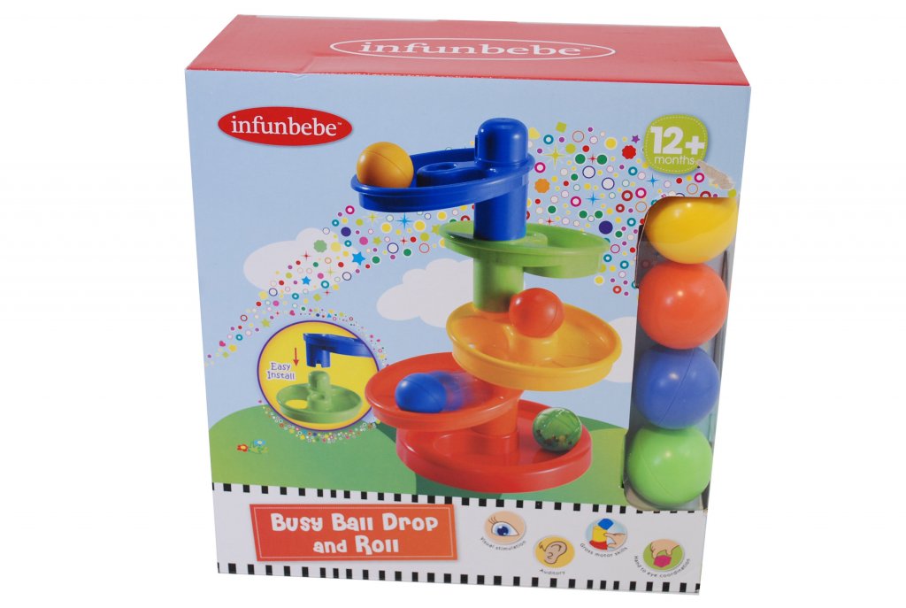 En fargerik bane som bidrar til å utvikle barnets motoriske ferdigheter. Plassere de ulike baller på toppen og se dem, så bla nedover gjennom fem forskjellige baner.