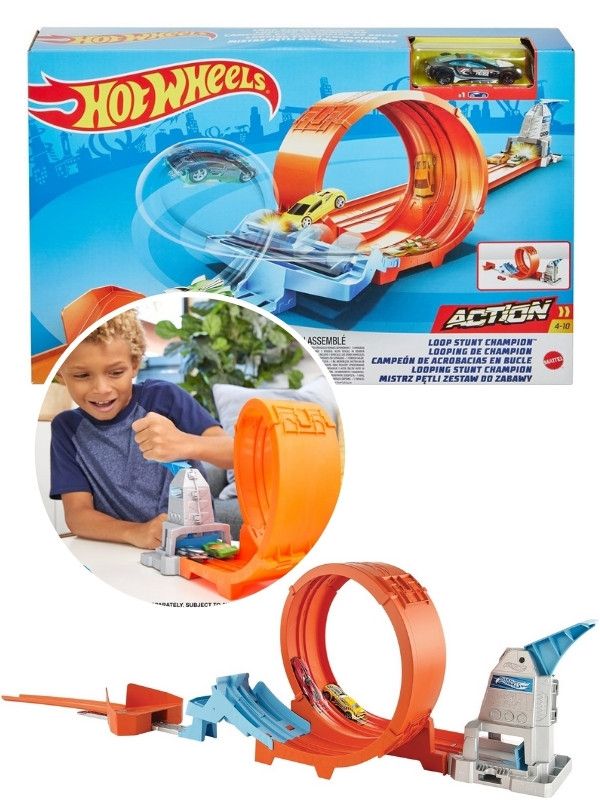 Hot Wheels Loop Stunt Champion-leketøyet tilbyr den ultimate bilbanen som kombinerer både racing og stunts, med en dobbel skyterampe, dobbeltsporsløkke, rampe med fjærer og justerbart landingsområde. Barn kan eksperimentere med kraft og teknologi mens de skyver Hot Wheels-bilene sine gjennom løkken og kjører mot landing. En 1:64 Hot Wheels-bil er inkludert i settet.