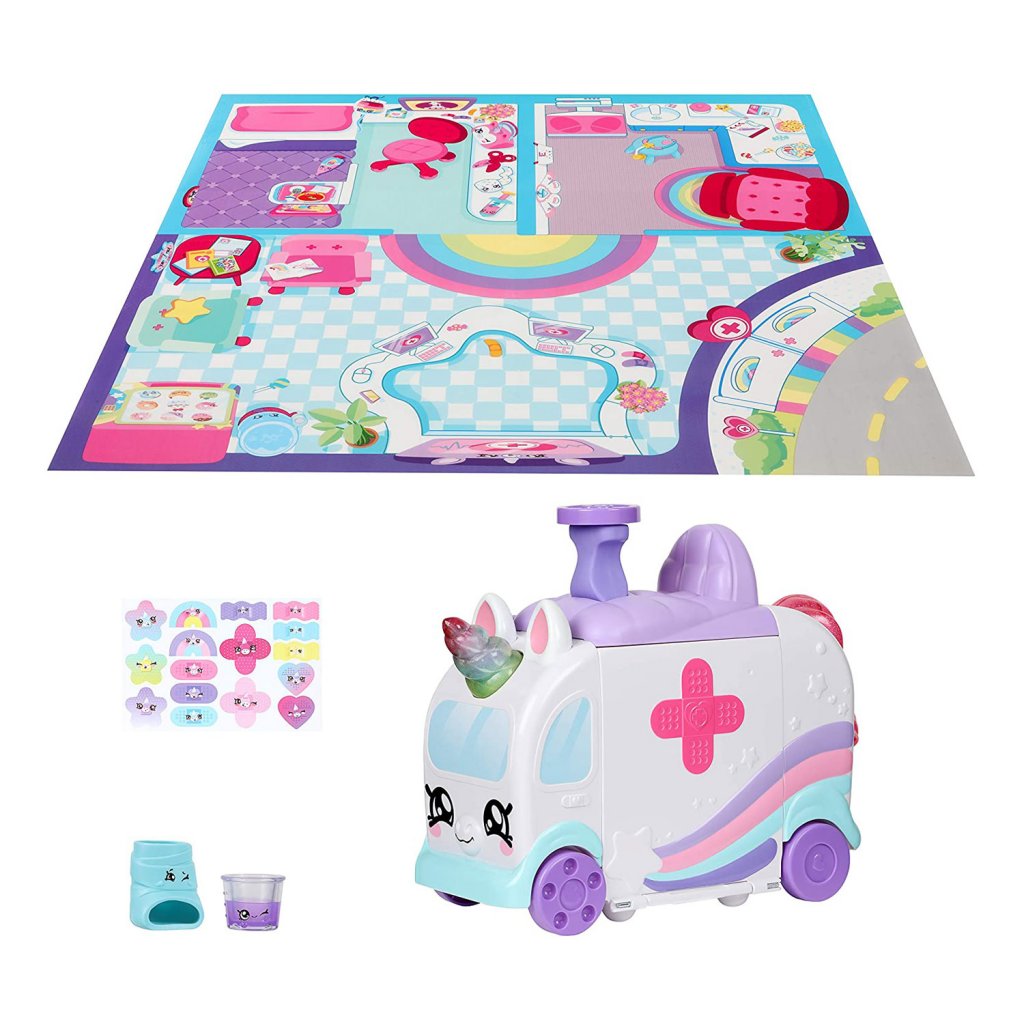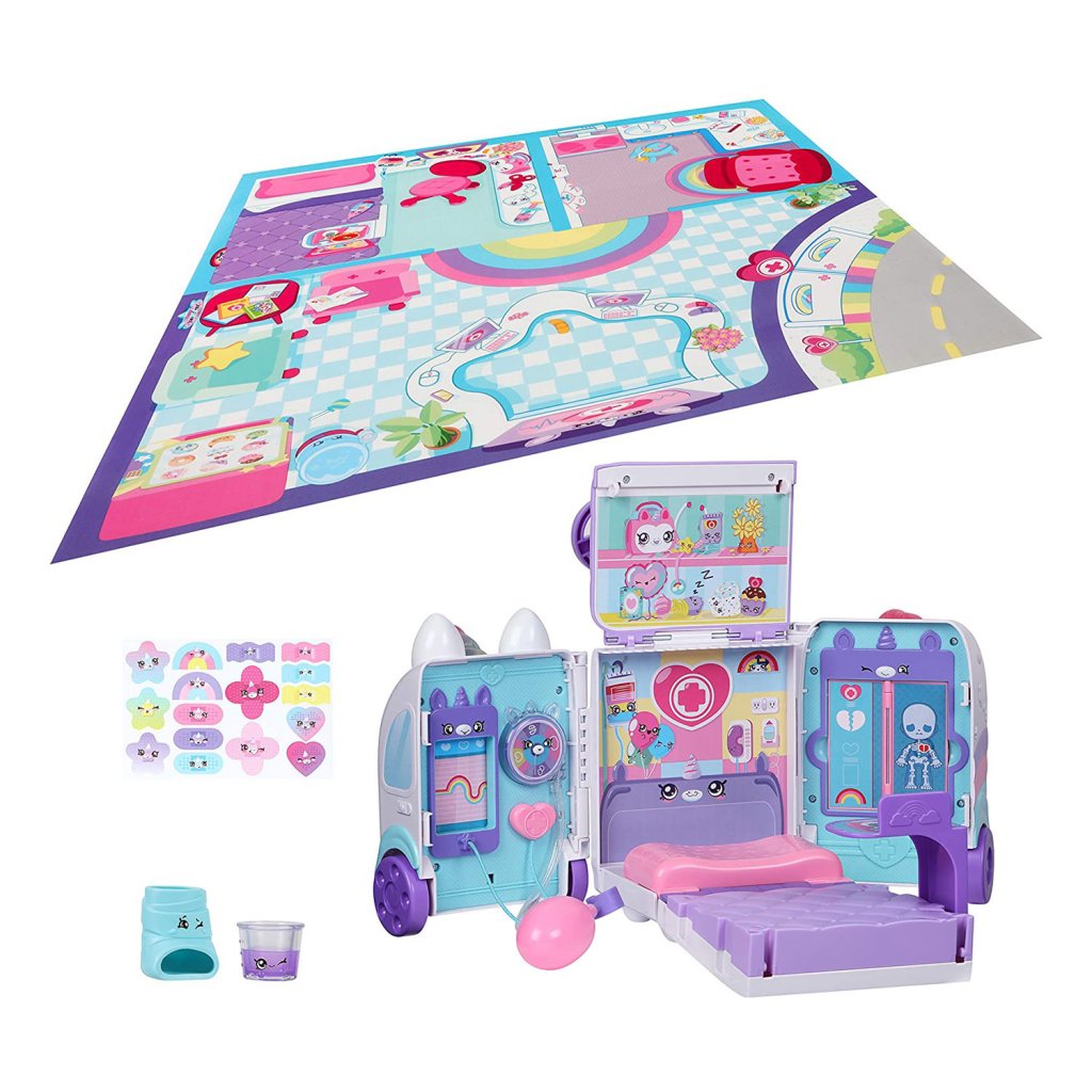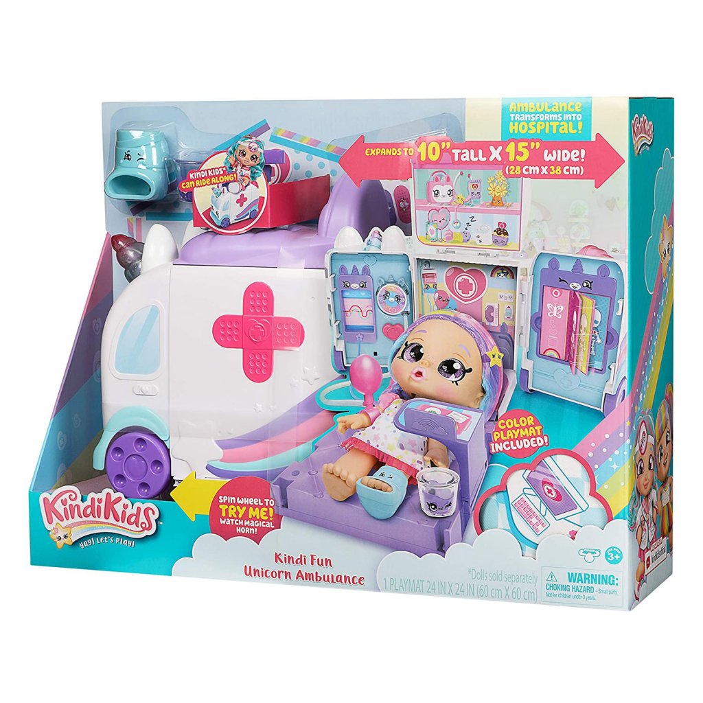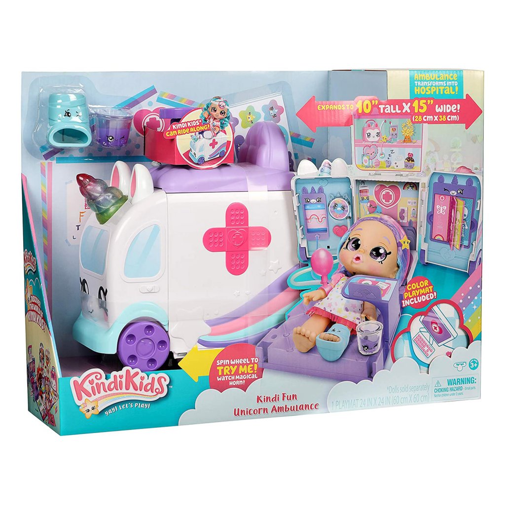 Kindi Kids Hospital Leken med en ambulanse som kan gjøres om til et sykehus. Dette søte sykehussettet med flere morsomme funksjoner fremhever alle som føler seg syke. Mens ambulansen beveger seg fremover, snurrer det glitrende enhjørningshornet. Vel fremme bretter du ut ambulansen og starter undersøkelser på sykehusrommet. Trykk på blodtrykksmåleren og måleren vil spinne på veggen, snurre hornet og du vil se hvordan pulsbølgene beveger seg og blar gjennom røntgenplatene. Medisinskoppen inneholder flytende væske. Lekematte med sykehusmotiver som gjør spillet enda morsommere er også inkludert.