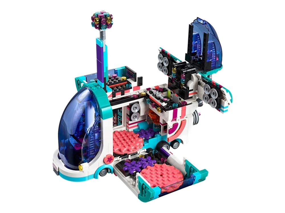 buss drosje, tak og folding sider spille komfortabelt i et hjørne av bussen. Den har også 2 pop-up høyttalere, en LEGO murstein med lys som lyser opp roterende dansegulv, en disco ball med fargerike gjennomsiktige deler og annet tilbehør. Gjør deg klar for endeløse timer med moro med dette settet med tegn Disco Kitty, Melody, Tempo og Zebe.