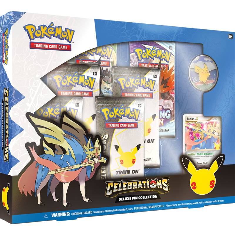 I denne utgaven av esken fra Pokémon Celebrations presenterer promo -figuren Zacian LV.X. Booster -kortene fra Celebrations kommer i en begrenset utgave, og disse er ikke tilgjengelige i den vanlige serien.