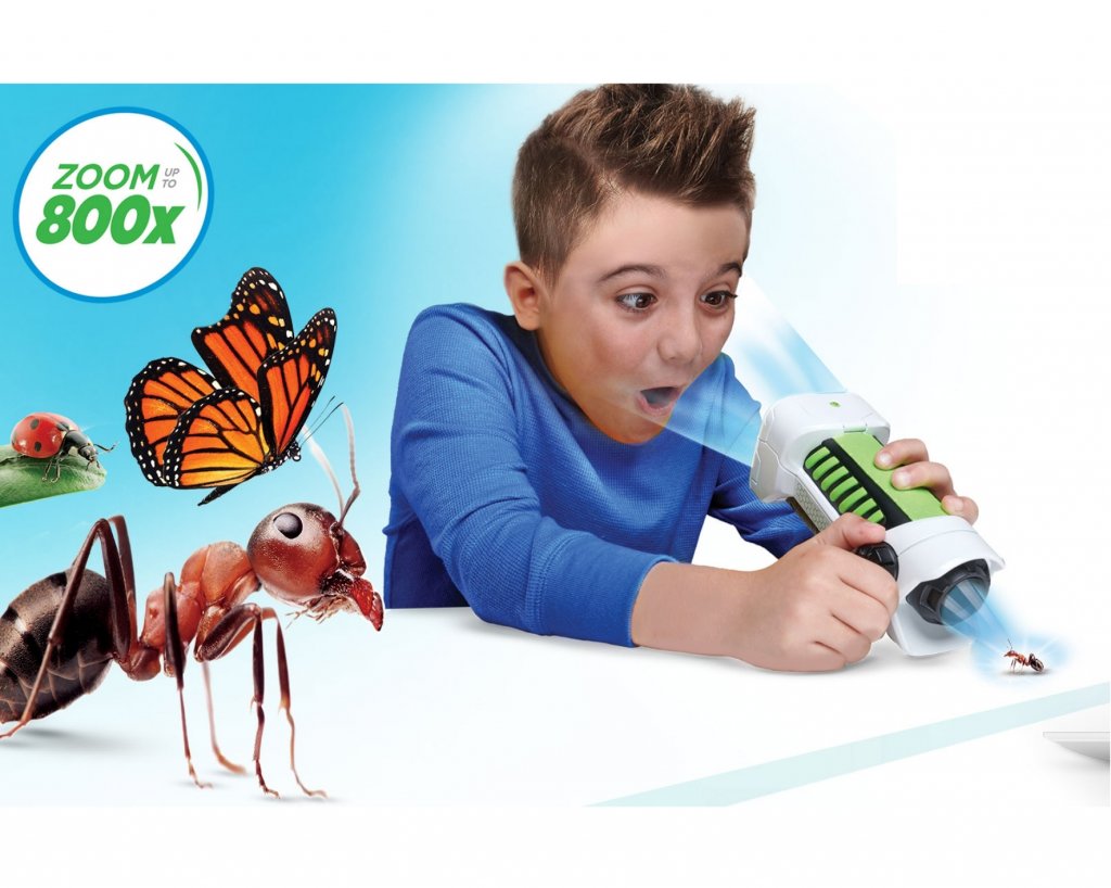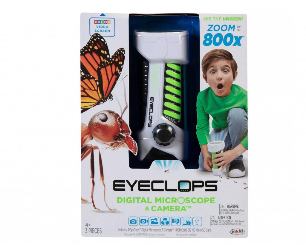 Oppdag og lær om den usynlige verden rundt deg med det nye Eyeclops ™ Digital Microscope & Camera. Ta den på farten, forstørre gjenstander innendørs og utendørs! Slå av zoomen og bruk som vanlig kamera til å ta bilder eller ta opp video. Del dine funn ved å laste opp bilder eller videoer til en datamaskin. Perfekt for skoleprosjekter eller andre S.T.E.M. aktiviteter. Inkluderer Eyeclops ™ Digital Microscope, 512MB MicroSD-kort og USB-kabel. Den fantastiske mikroskopiske verden venter på at du skal oppdage det! Forstør objekter med digital zoom! Innebygd 2,4-tommers fargeskjerm! Slå av zoom og bruk som vanlig kamera eller videospiller! Ta bilder og video. Last ned via USB eller MicroSD.