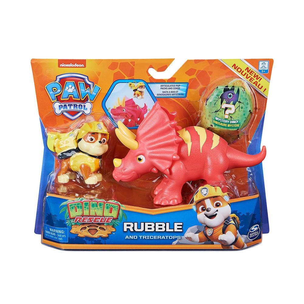 Paw Patrol Dino Rescue figurpakke med murstein og 2 dinosaurer. Den ene dinosauren er en triceratops som du ser på bildet, og den andre er en mindre dinosaur som er i det grønne overraskelsesegget. Når du trekker halen på triceratops, løfter den hodet for å beskytte kroppen mot rovdyr. Rubble har en gravemaskin på baksiden som kan brettes ut.