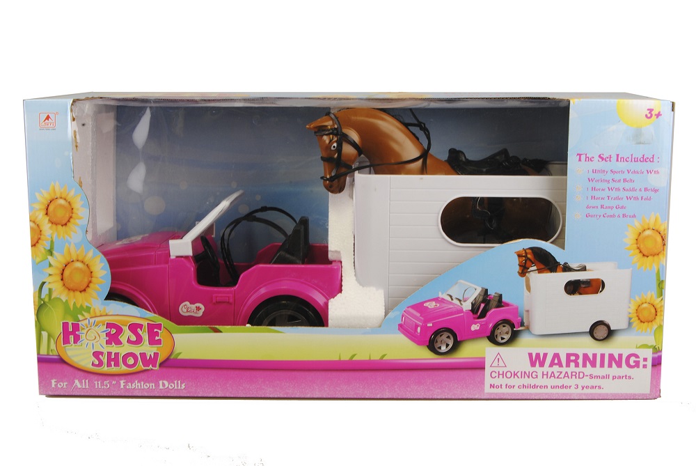 Det er på tide å komme på hesteshowet og vise alle deres harde trening har tjent på! Men hvordan komme seg til hesteshowet uten å slite ut hesten! Ja, men en fin rosa jeep med en vakker hvit hestetransport som sitter fast bak jeepen!