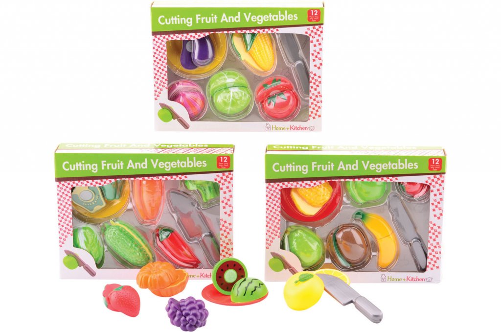 som kan deles matvare leker, 12 deler, inkludert grønnsaker, frukt og kniv. Lat som er festet med borrelås, slik at du kan dele grønnsakene med leketøy kniv. De bare satt sammen igjen og kan brukes flere ganger. Pakke inneholder frukt, grønnsaker, og en plast kniv.