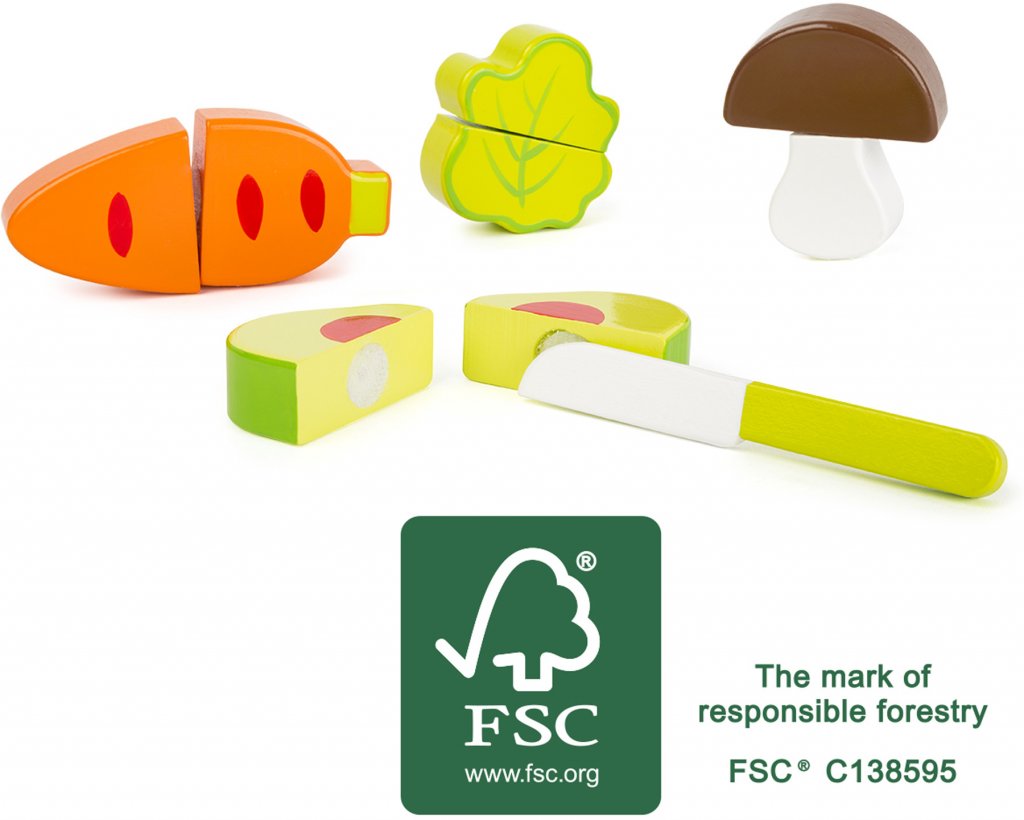 avtagbare grønnsaker i treet som kan være lett sepereras med den medfølgende träkniven. De solide trebiter holdt sammen med borrelås. Dette produktet er laget av FSC & reg; 100% -sertifiserte trevirke.