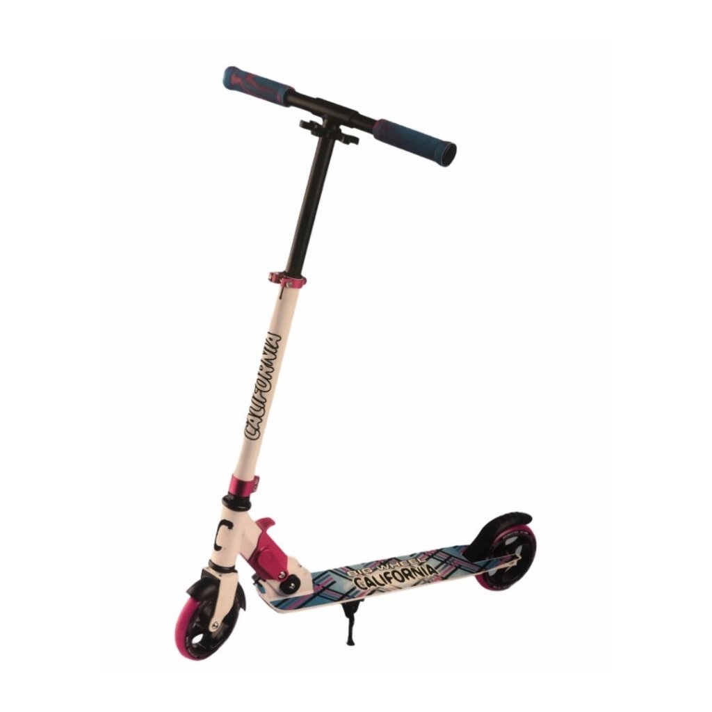 Scooteren har en kul hvit, blå og rosa design! Fungerer bra for eldre barn og voksne.
