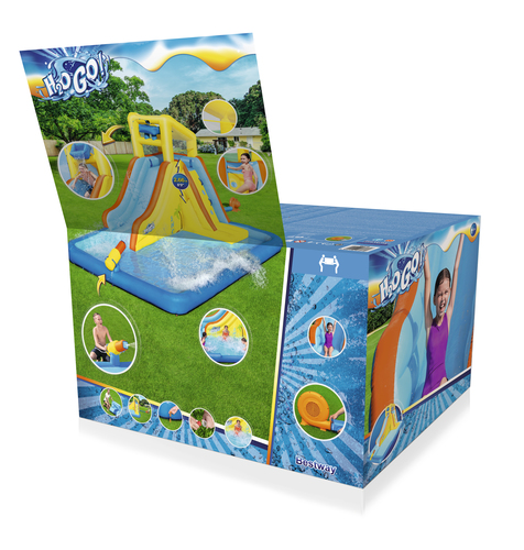 Förvandla din trädgård till vattenparadis med Bonanza vattenlekland pool. Ha roligt i flera timmar med vattenland pool från Bestway som man blåser upp och är tillverkad i slitstark och färgglad material. Starka luftpumpen blåser upp vattenparken på några minuter och håller den stabil. Ingår rutschakana, klätterväg, pool och en vattenpistol som sprutar vatten.