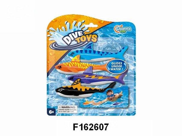 Her kommer fire nye badkamerater! Disse dykleketøyene er designet som tøffe haier med fine farger. De glir lekkert gjennom vannet og er morsomme og spennende å prøve å fange. Å leke med haiene fremmer svømmeferdigheter og dykkeevner, samtidig som det gir mye latter og glede. - Dykleker designet som haier - 4 stk