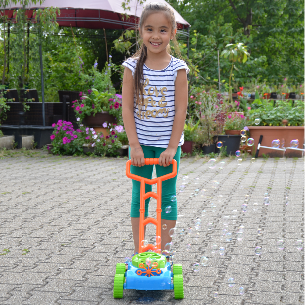 Barnet kan endelig klippe gresset samtidig at noe spennende med klipperen. Såpebobler blåses ut fra klipperen mens barna kan gå rundt med gressklipperen i hagen. Trykk på knappen, vil den komme ut såpebobler