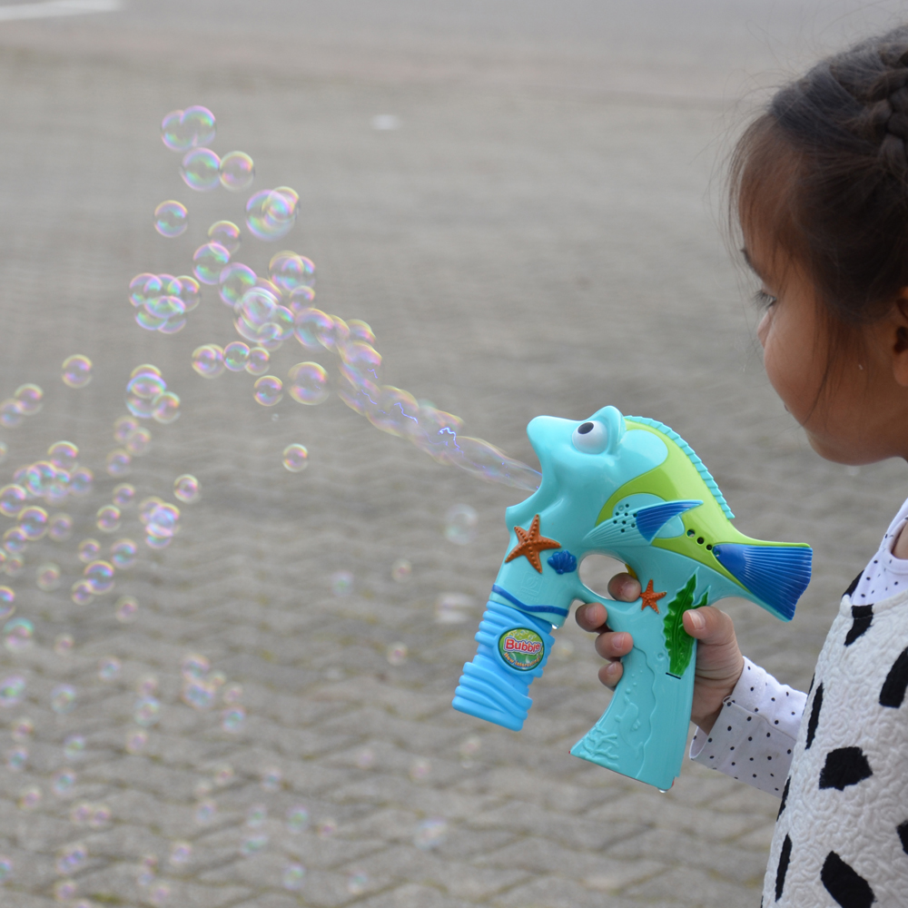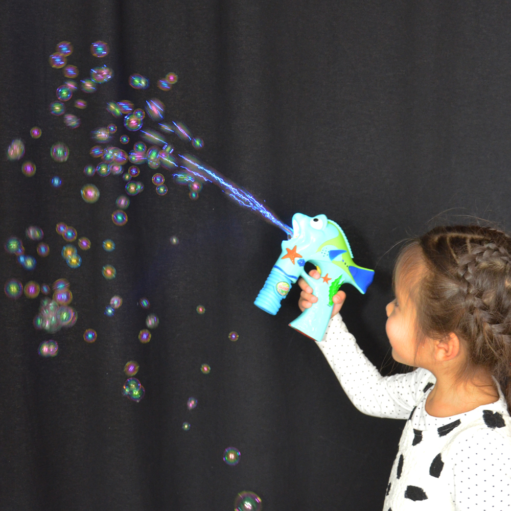 Såpbubbel pistol tent og bobler ut masse såpebobler. En flaske fylt med såpebobler inkludert som å skru pistolen. Kan fylles med vanlig såpe boble væske.