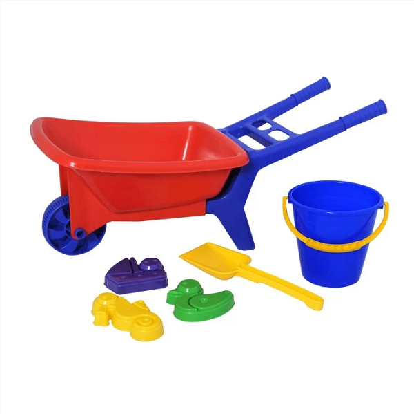 Denne farverige trillebør er stabil og holdbar til daglig brug. Derudover har den hårde plasthjul og støtteben, der holder den stabil. Men trillebåren er fyldt med et stort antal sandkasser. Sandlegetøjet består af en skovl, 3x sandformer med vanddyrmotiver og en spand! Alt leveres online.